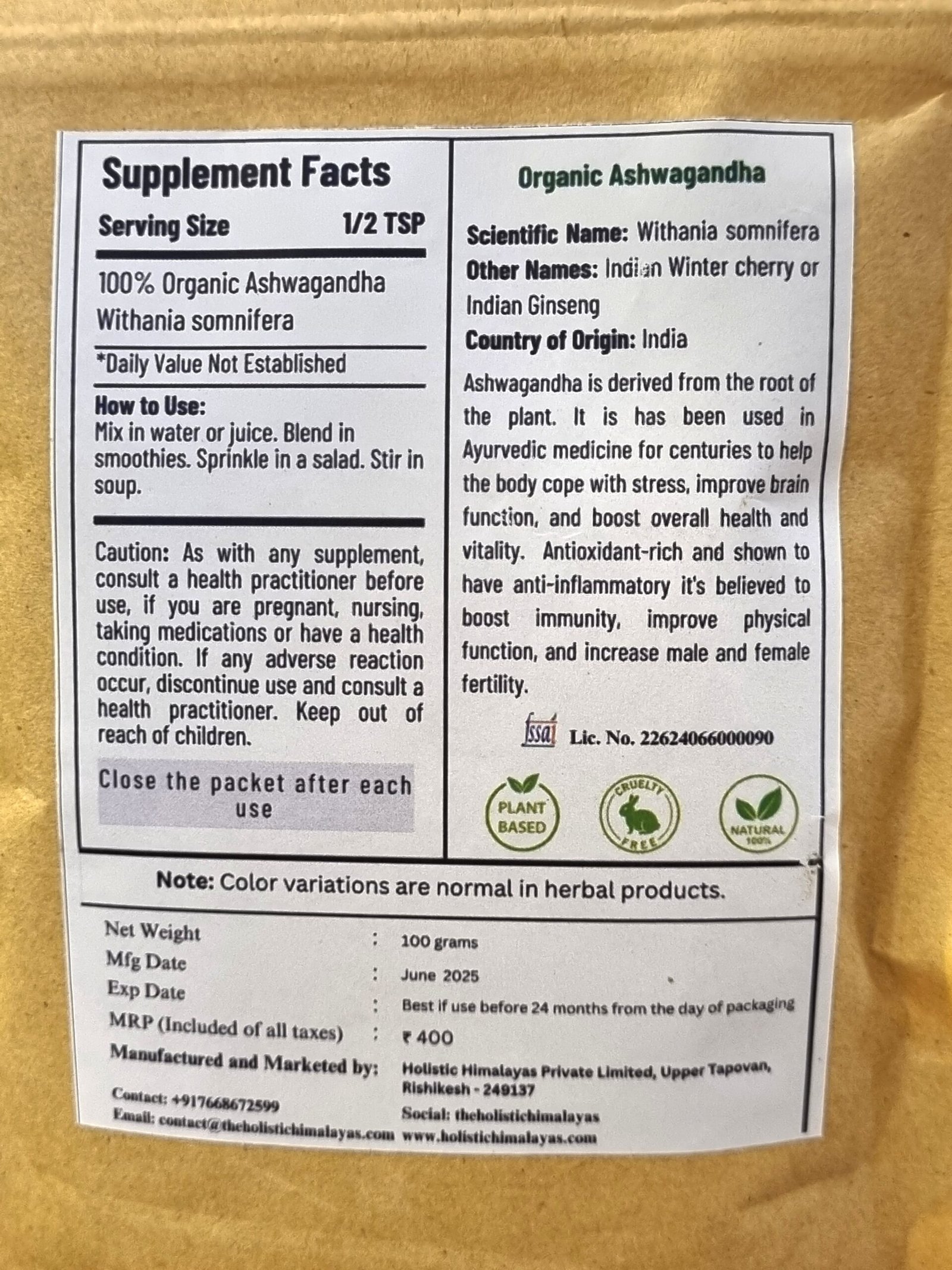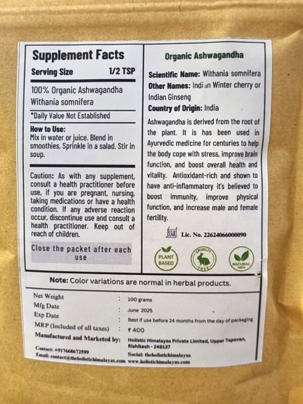 Holistic Himalayas Ashwagandha is a premium Ayurvedic herb sourced from the Himalayan region. Known as a powerful adaptogen, Ashwagandha is traditionally used to reduce stress, boost energy, and enhance overall wellness.