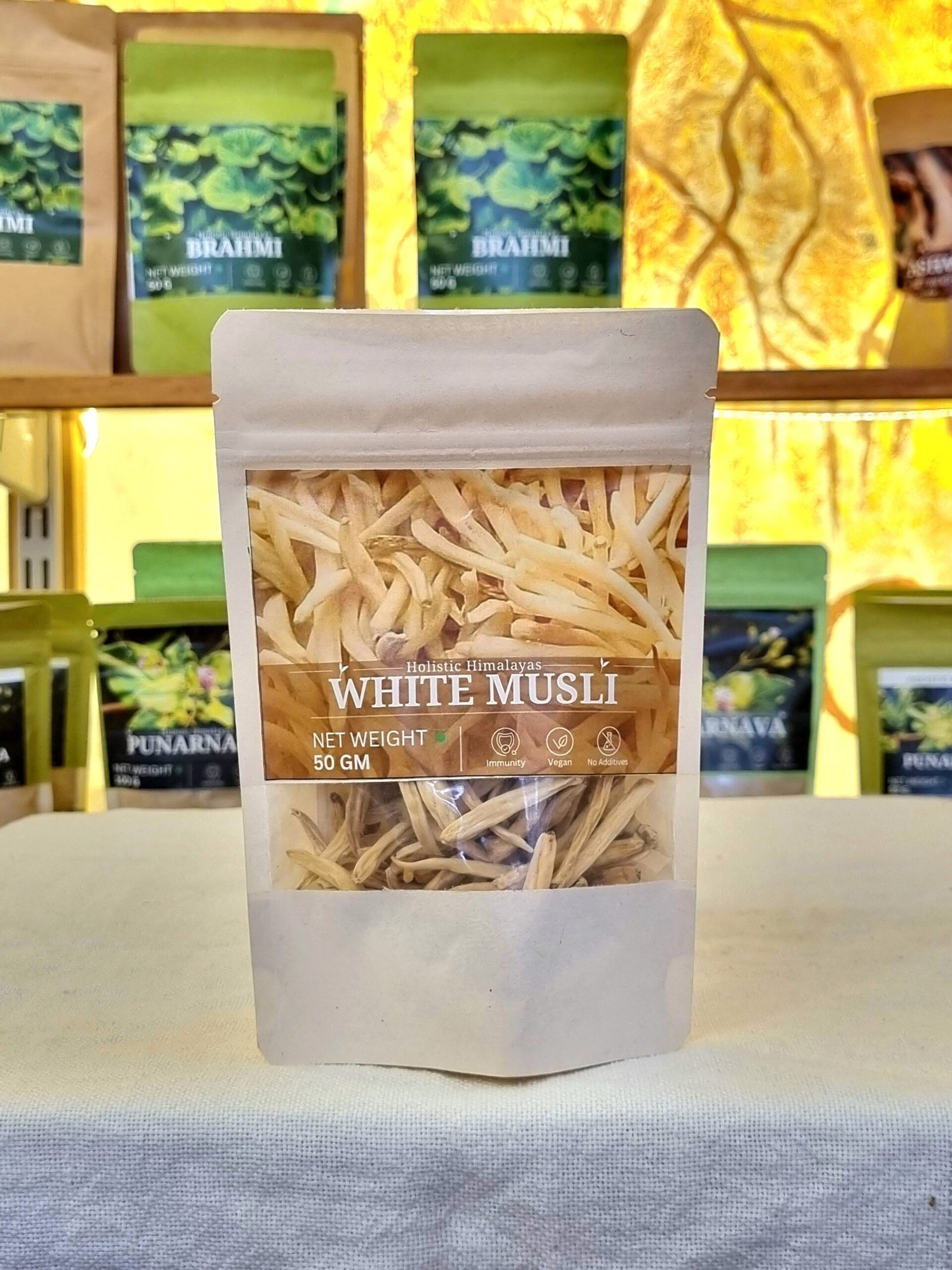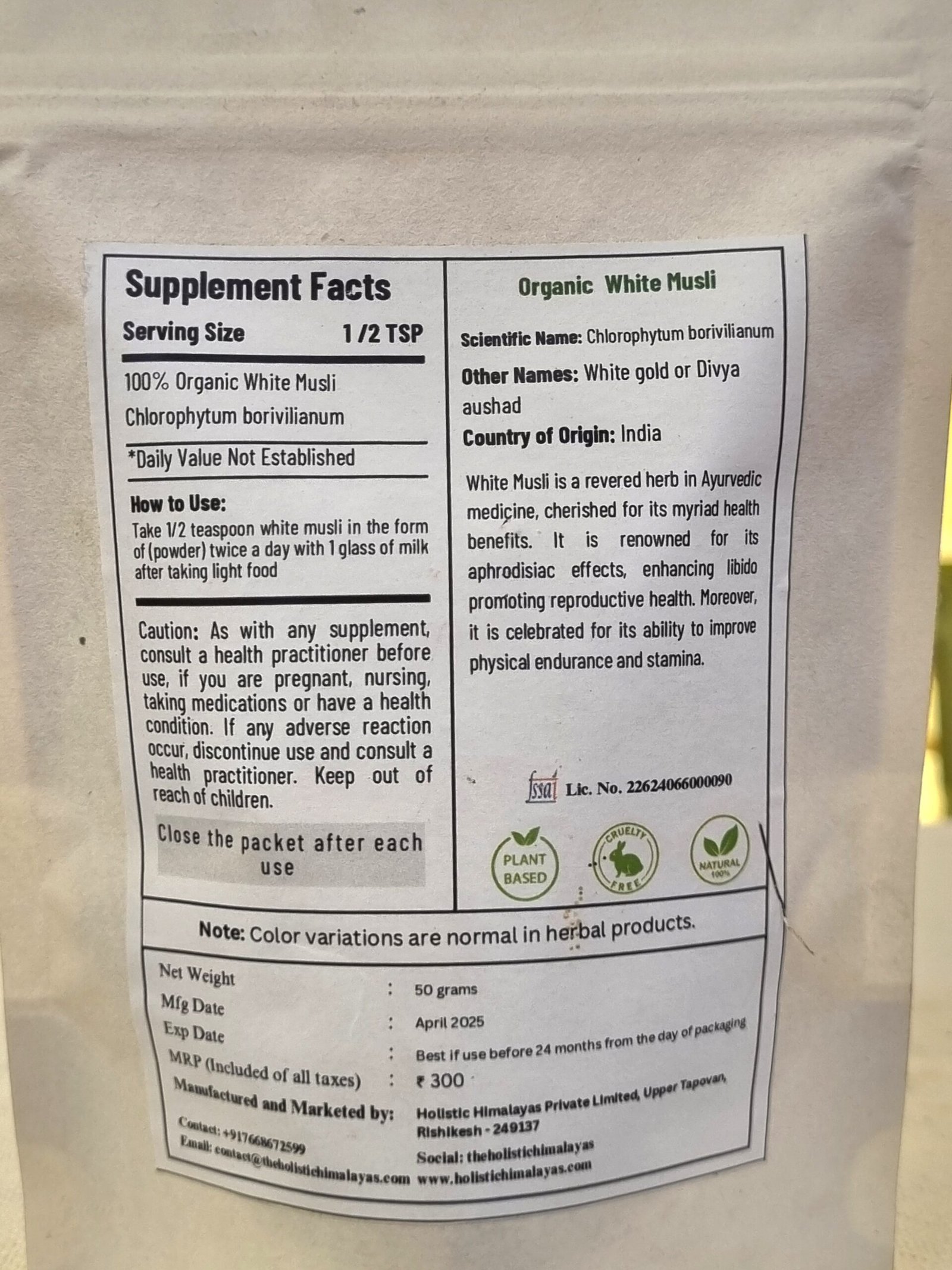 White Musli of Holistic Himalaya is a pure, high-potency herbal supplement made from the finest roots of Chlorophytum borivilianum, carefully sourced from pristine Himalayan regions. Known in Ayurveda as a powerful Rasayana (rejuvenator), it is designed to naturally enhance strength, stamina, and overall vitality.