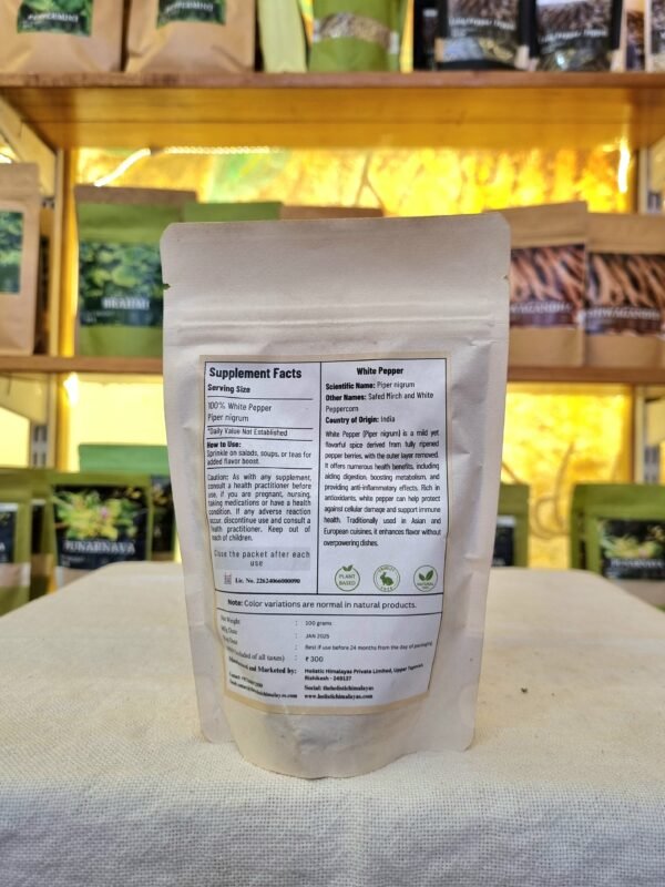Sourced from the pristine Himalayan regions, Holistic Himalaya White Pepper is a premium-quality spice crafted with purity and conscious wellness in mind. Carefully processed from fully ripened pepper berries, the outer layer is gently removed to reveal a smooth, aromatic core that delivers a mild heat and earthy flavor.
