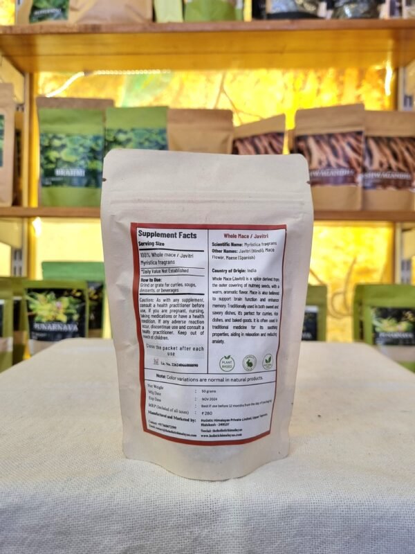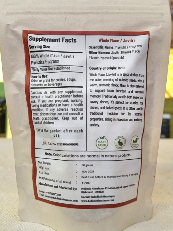 Holistic Himalaya Whole Mace (Javitri) is a premium-quality, 100% natural spice sourced from carefully selected farms in the Himalayan region. Mace, known as Javitri in India, is the delicate, lacy outer covering of the nutmeg seed, prized for its warm aroma, vibrant color, and subtly sweet-spicy flavor.